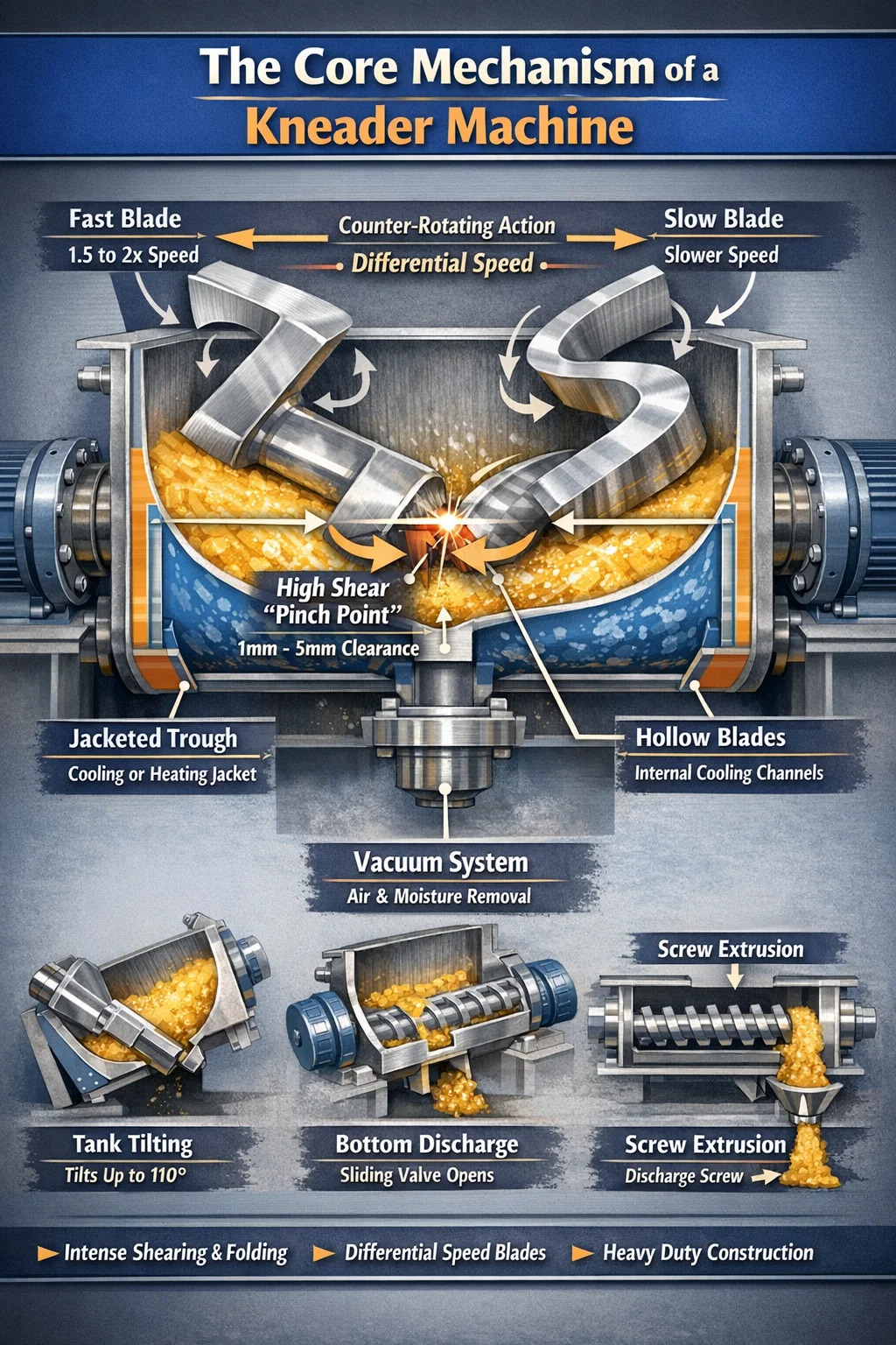 A æltemaskine fungerer ved at bruge et par modsat roterende blade (typisk Z-formede eller Sigma-blade), der arbejder ved forskellige hastigheder i et W-formet trug. Det primære formål er at udsætte højviskose eller halvfaste materialer for intens klipning, foldning og kompression . I modsætning til standardmixere, der blot flytter materiale, tvinger en æltemaskine stoffet gennem snævre mellemrum mellem knivene og trugets vægge, hvilket sikrer en homogen blanding af ingredienser, der ellers er modstandsdygtige over for strømning.