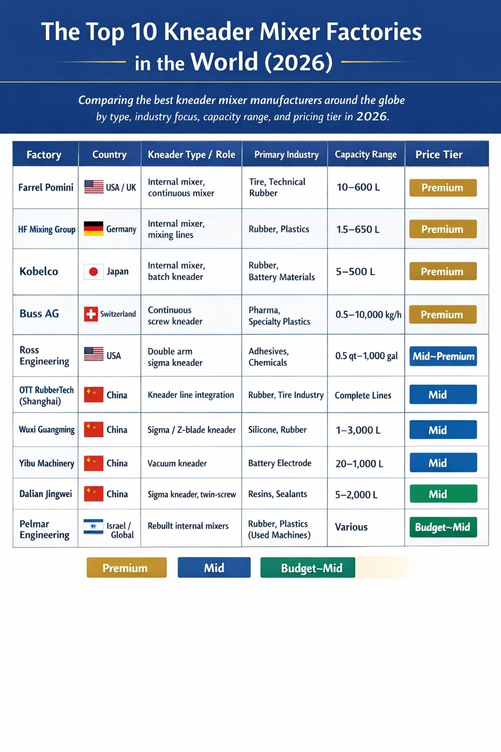 Hvis du køber en æltemaskine mixer til gummi, silikone, klæbemiddel, batterimaterialer eller enhver højviskositetsblanding, vil den producent, du vælger, direkte bestemme udstyrets levetid, blandingskvalitet og de samlede ejeromkostninger. Efter at have evalueret produktionsskala, tekniske certificeringer, global installationsbase og kundefeedback på tværs af snesevis af leverandører, de ti fabrikker, der konsekvent leder verden inden for fremstilling og levering af ælteblandere i 2026 er: Farrel Pomini (USA/UK), HF Blandegruppe (Tyskland), Kobelco (Japan), Buss AG (Schweiz), Ross Engineering (USA), OTT RubberTech International Trading (Shanghai) Co., Ltd. Chemical Machinery (Kina) og Pelmar Engineering (Israel). Hver af dem har en særskilt styrke - uanset om det er ultrahøj drejningsmomentkapacitet, sanitært design af farmaceutisk kvalitet, fuld gummiæltelinjeintegration eller omkostningskonkurrencedygtige priser for produktion i mellemvolumen.