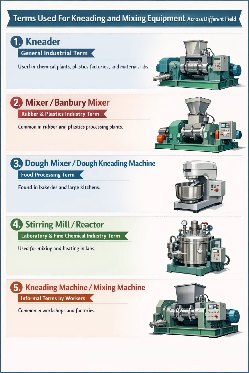 Med hensyn til udstyr som "æltemaskiner" eller "dejblandere," de navne, der bruges til dem, varierer meget på tværs af forskellige områder og industrier. Selvom deres kernefunktion er at blande materialer gennem kraftig æltning, er de navne, folk bruger, meget forskellige afhængigt af anvendelsen.