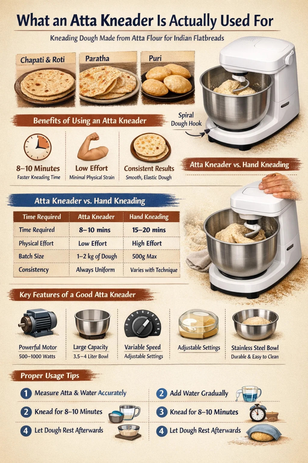 - Paratha dej: Lidt stivere end roti-dej, fordi den skal holde lag, når den foldes med ghee eller smør. En æltemaskine udvikler gluten lige nok til at skabe struktur uden at gøre dejen sej.